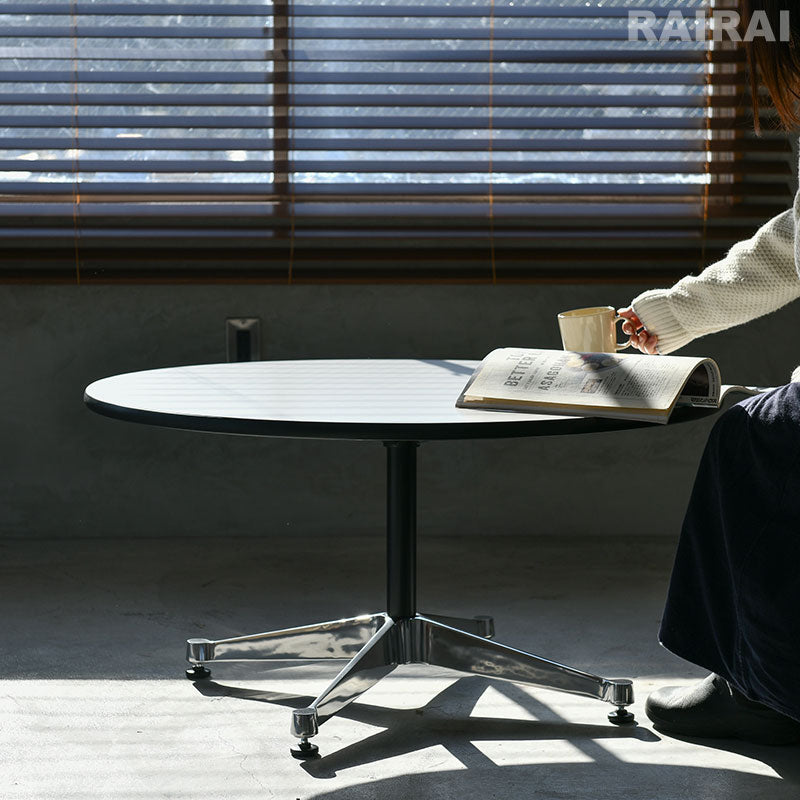 ハーマンミラーの代表的なデザイナー、チャールズ&レイ・イームズ夫妻によるテーブル。コントラクトベースの丸テーブルはシンプルでどんなインテリアにも合わせやすいデザイン性はもちろんのこと、安定感のある頑丈な作りをしているため長いあいだ使用することが出来ます。 その頑丈さは新品での保証期間が12年間という自信にも表れています。 様々な物で溢れかえり移り変わりの激しい時代の中で、50年以上変わらないデザインであることが、コントラクトベーステーブルが高いデザイン性と使いやすさを兼ね備えたテーブルである証といえます。