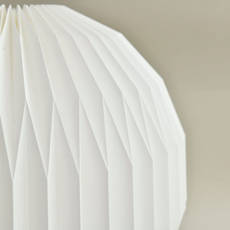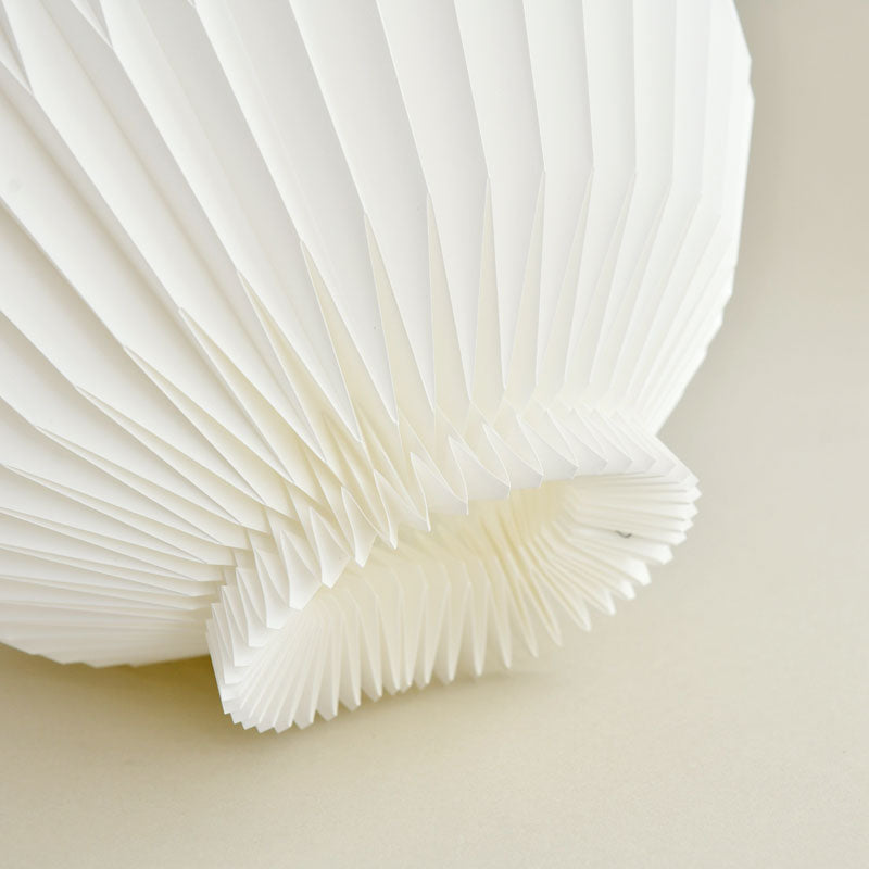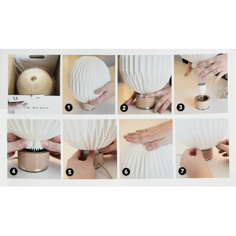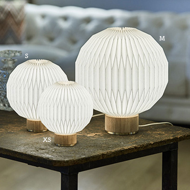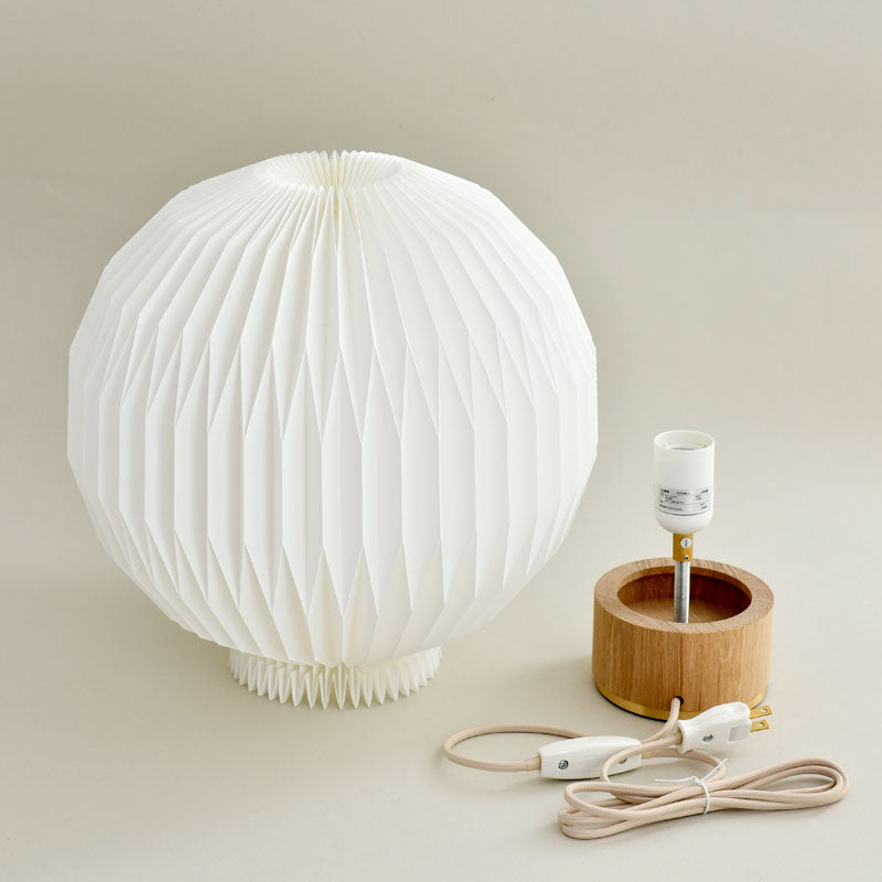 レ・クリントの数ある照明の中でも、最も精巧なプリーツで作られている照明のひとつです。光源が放つ光を細かなプリーツの球体が包み込むことで、空間に柔らかく温かみのある光を灯すと同時に、美しい陰影を創り出します。従来のフルーツランタン(モデル107)にオーク材のベースを合わせることで、軽やかに浮かび上がらせ、テーブルランプとして身の回りのどこでもフルーツランタンをお楽しみいただけるようになりました。リビングルームや寝室(ベッドルーム)に間接照明としてもおすすめです。 |