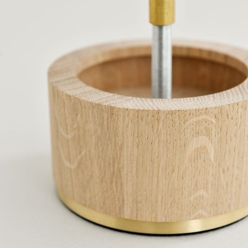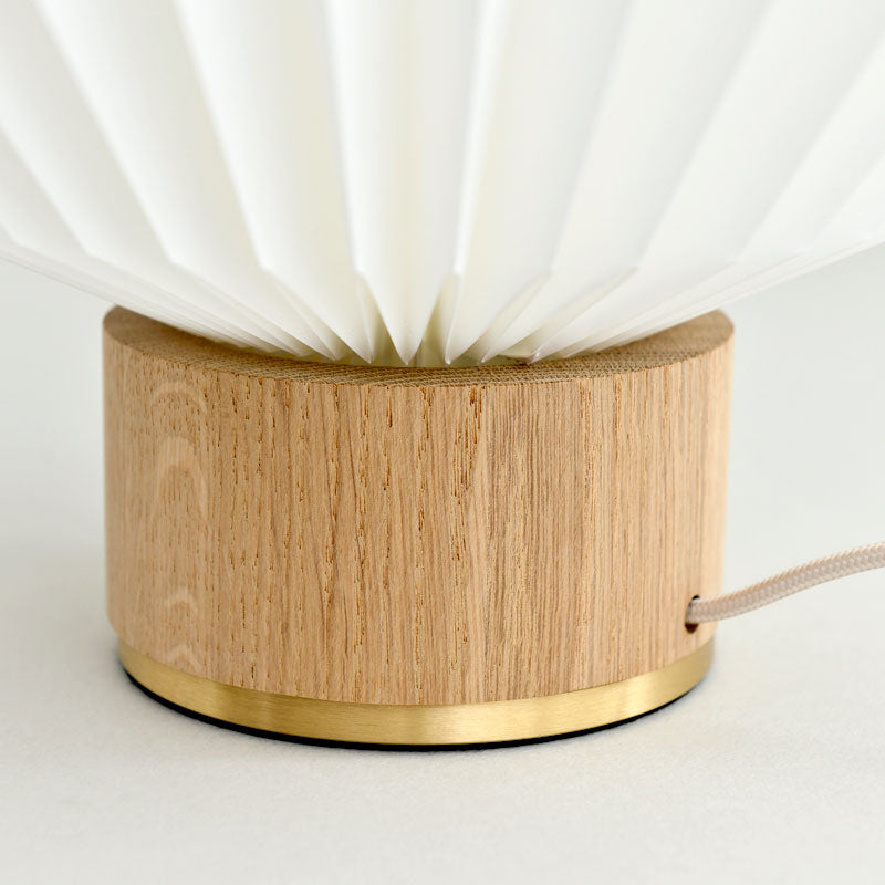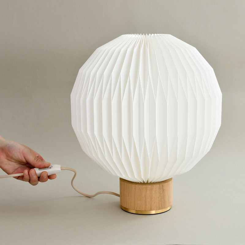光源が放つ光を細かなプリーツの球体が包み込むことで、空間に柔らかく温かみのある光を灯すと同時に、美しい陰影を創り出します。従来のフルーツランタン(モデル107)にオーク材のベースを合わせることで、軽やかに浮かび上がらせ、テーブルランプとして身の回りのどこでもフルーツランタンをお楽しみいただけるようになりました。