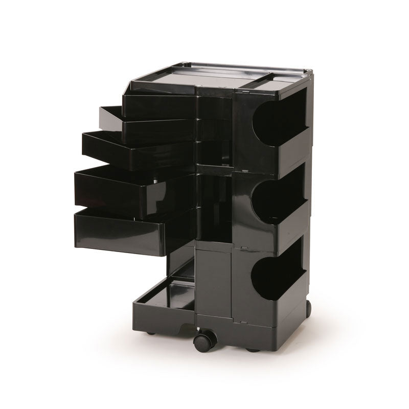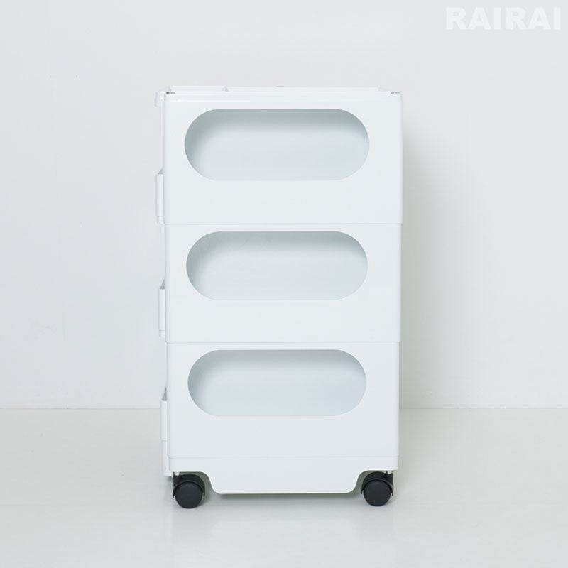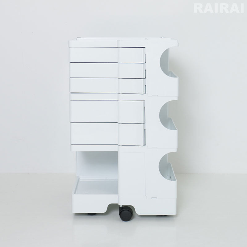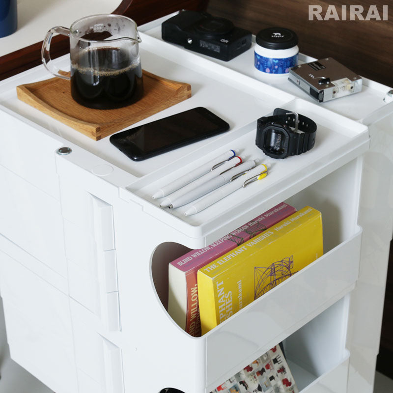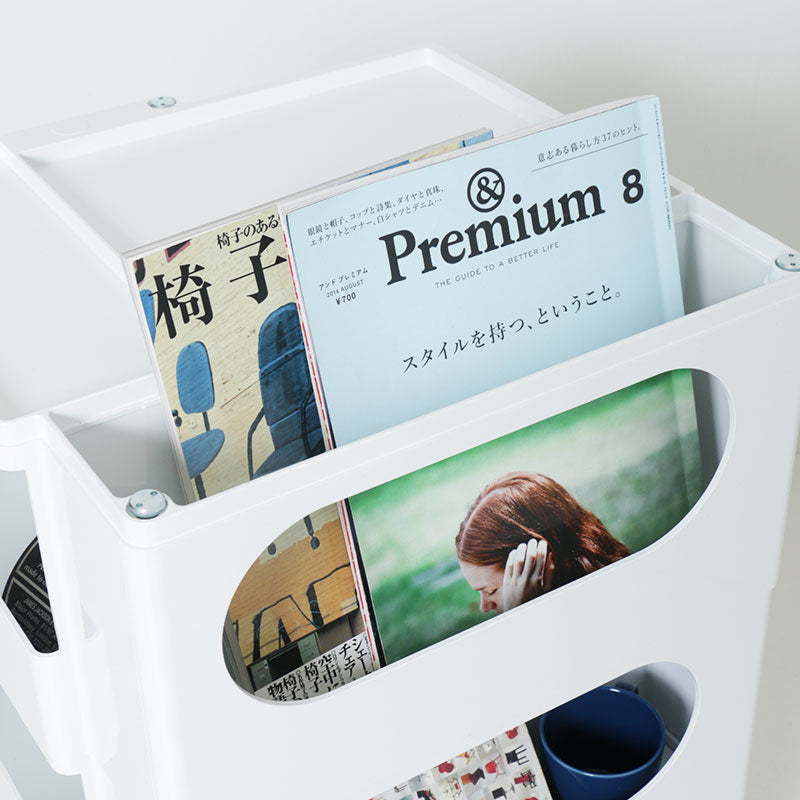 ボビーワゴンは、キャスター付きの本体を回転させることで側面4面すべてを効率的に使える、デザイン性と機能性に優れた収納家具です。